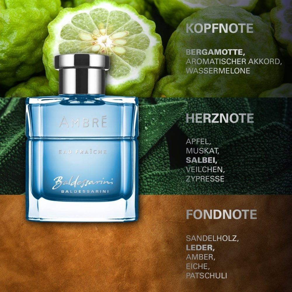 Baldessarini Ambre Eau Fraîche EDT je svježija, lakša i modernija interpretacija klasičnog Ambre mirisa, namijenjena muškarcima koji vole eleganciju uz izraženu dnevnu svježinu. Otvaranje donosi osvježavajuće citrusne note bergamota i lubenice koje pružaju čist i energičan prvi dojam. U srcu se razvijaju aromatični akordi muškatne žalfije i jabuke, dajući parfemu profinjen i muževan karakter. Baza je topla i uravnotežena, s notama ambre, sandalovine i kože koje ostavljaju elegantan, ali nenametljiv trag. Ovaj parfem je idealan za svakodnevno nošenje, posao i tople dane, kada želite djelovati dotjerano, svježe i samouvjereno. Diskretna, sofisticirana bočica savršeno prati stil brenda Baldessarini.