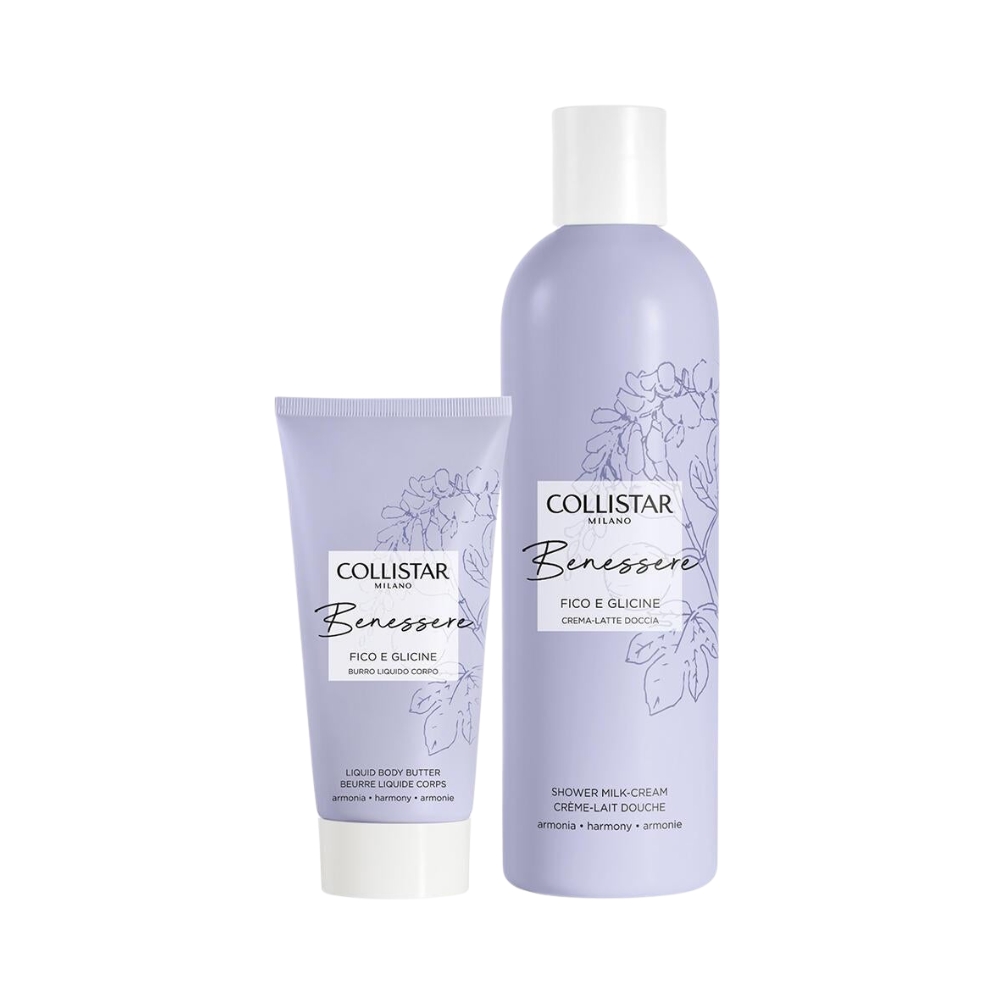 Collistar Set Benessere – Fig & Wisteria je luksuzan wellness set za njegu tijela koji pruža osjećaj opuštanja, svježine i profinjene elegancije. Mirisna kompozicija spaja sočne i blago slatke note smokve s nježnim, cvjetnim akordima glicinije (wisteria), stvarajući harmoničan i umirujući miris koji budi osjećaj mediteranskog mira. Proizvodi u setu njeguju kožu, ostavljajući je mekanom, hidriranom i nježno parfemisanom. Set je idealan za svakodnevnu rutinu njege, trenutke opuštanja ili kao elegantan poklon za posebne prilike. Kvalitet i senzualno iskustvo potpisuje renomirani italijanski brend Collistar.