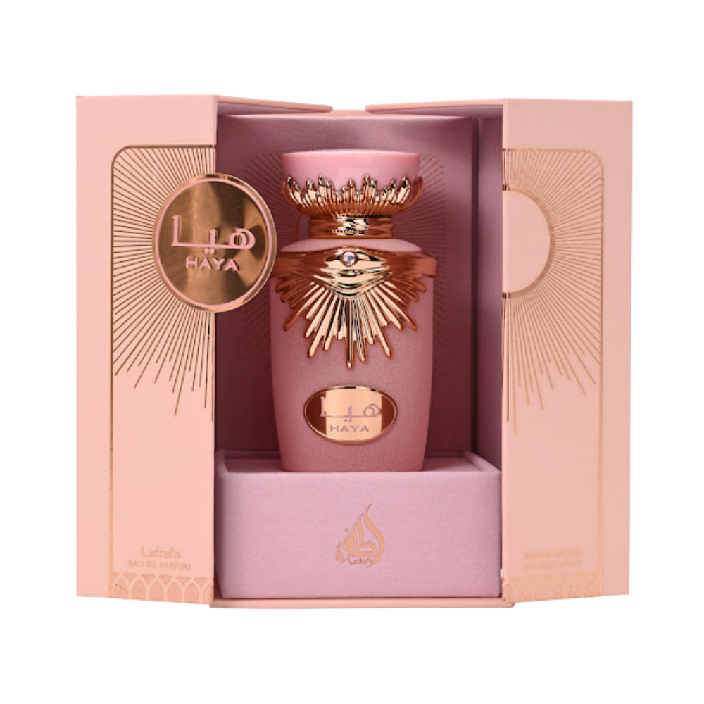 Haya od Lattafa Perfumes je miris za žene. Ovo je novi parfem. Haya je predstavljen 2022. Gornje note su Šampanjac, Jagoda, Tangerina, Crvena narandža i Ruža; srednje note su Gardenija, jasmin i Vanilna orhideja; bazne note su Amber, Sandalovo drvo i Kesten.