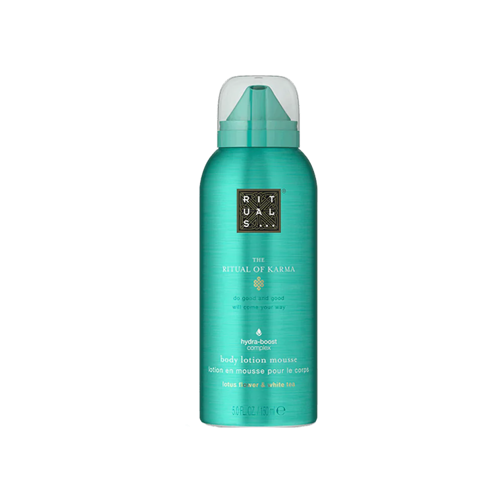 Rituals The Ritual of Karma Body Lotion Mousse 150 ml je luksuzna pjena-losion za tijelo koja se pri dodiru s kožom pretvara u bogatu, hranjivu njegu. Lagana mousse tekstura se lahko razmazuje, brzo upija i ostavlja kožu intenzivno hidriranom, glatkom i svilenkastom bez masnog osjećaja. Obogaćena je prepoznatljivim mirisom bijelog čaja i lotosa, koji pruža osjećaj svježine, pozitivne energije i dugotrajnog komfora. Idealna je za svakodnevnu upotrebu, posebno nakon tuširanja, te je pogodna za sve tipove kože. Praktično pakovanje i inovativna tekstura čine je savršenim izborom i za putovanja.