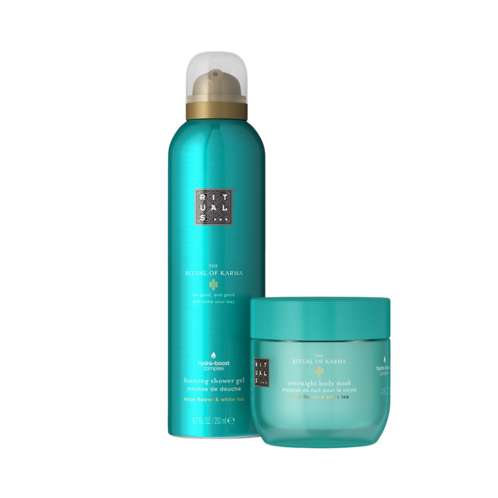 Rituals The Ritual of Karma Set donosi luksuzno iskustvo njege tijela inspirisano pozitivnom energijom ljeta. Ovaj elegantan set sadrži masku za tijelo i gel za tuširanje koji zajedno pružaju osjećaj dubinske njege, svježine i opuštanja. Gel za tuširanje nježno čisti kožu i stvara bogatu pjenu, dok maska za tijelo pomaže obnoviti i nahraniti kožu, ostavljajući je mekom i glatkom. Mirisna kompozicija sa svetim lotosom i bijelim čajem donosi svjež i elegantan miris koji pruža osjećaj harmonije i blagostanja. Idealan je kao poklon ili kao dio Vašeg svakodnevnog rituala njege.